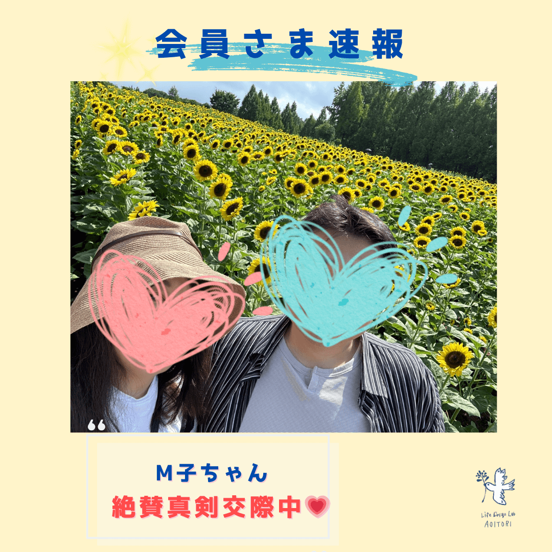 《会員さま速報》 🌻真剣交際中のM子ちゃんから、夏の幸せデート報告🌻 2025年9月7日 広島で婚活プロデュース〈婚活パーティー・結婚相談所〉をしている青い鳥ディレクターの仁禮とも子です😊先日、絶賛真剣交際中のM子ちゃんから、真夏のほっこりデート報告と素敵な写真が届きました。ふたりで行くと決めたのは、一面に広がるひまわり畑🌻。実はM子ちゃん、行く前に「ふたりでやってみたいことがあるんです!」と、面談で語っていたのでした。それは――ひまわり背景にふたりの手を合わせてハートを作って写真を撮ること💑「わわわ💓 いいのが撮れたら見せてねっ🌻」と青い鳥も楽しみにしていたのです。 いざやってみると、彼はちょっぴりぎこちなく、ハート作りも不慣れな様子。その姿がツボに入り、ふたりで笑いながらのテイク1は…微妙な仕上がり😂でも、テイク2で「いい感じ!」な一枚が完成したそうで🥰 すると今度は彼からも、「僕もやってみたいことがある」と。それは――ふたりの2ショット写真💑これからたくさん増えていくM子ちゃんと彼の2ショット、その最初の1枚がひまわり畑だなんて😊✨最高にキュートで、まるでふたりのアルバムの表紙を飾るような、完璧な1枚💛明るくて可愛いM子ちゃんらしい、とても素敵なご報告でした💛🌟プロポーズ目前、満開のひまわりに負けない笑顔が近々見られることを楽しみにしています。。。。 「ライフデザインラボ 青い鳥」では、婚活プロデュース・成婚退会後まであらゆるサポートとサービスを用意しています 広島で婚活するなら! ライフデザインラボ 青い鳥 まずは無料相談☆下記お問い合わせフォームからメッセージをお願いします 無料相談応募フォーム ライフデザインラボ 青い鳥は IBJ正規加盟店です