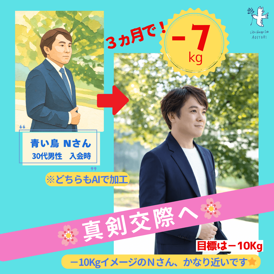 🌟青い鳥の『ボディメイク☆本気婚活コース』のご利用で、7キロの減量に成功された30代男性。