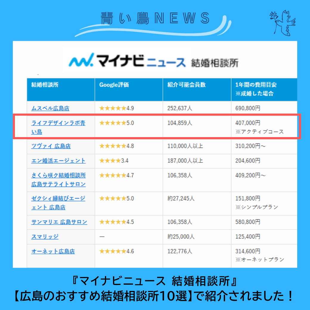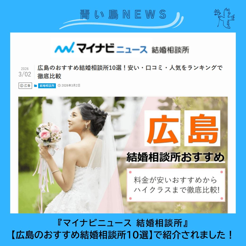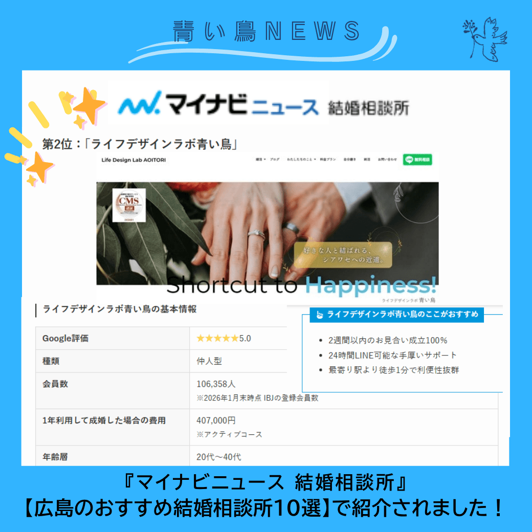 『マイナビニュース🌟広島のおすすめ結婚相談所10選!』に2位選出!掲載されました! 2026年4月21日 広島の結婚相談所、ライフデザインラボ青い鳥の仁禮とも子です😊このたび、「マイナビニュース 結婚相談所.」にて、「広島のおすすめ結婚相談所10選!」にライフデザインラボ青い鳥が《第2位》として選出、掲載されました✨全国規模の大手相談所が並ぶ中での2位に、正直「えっ…本当に?それも、あのマイナビ?!」と驚いています。でも同時に、日々会員様とやり取りを重ねながら、一歩ずつご縁をつないできたことを思うと、じんわり嬉しい気持ちでいっぱいです😊 『結婚』という人生の大切な場面でのサポートをお任せいただいていることに、心より感謝申し上げます。これからも、青い鳥らしく、お一人おひとりに寄り添いながら、ご成婚までしっかり伴走してまいります。この度はご紹介いただき、ありがとうございました✨ 〈「マイナビニュース 結婚相談所.」は、ビジネス、エンタメなどで知られる総合情報サイト「マイナビニュース」(株式会社マイナビ運営)の婚活情報専門サイトです〉▼掲載記事はこちらマイナビニュース🌟広島のおすすめ結婚相談所10選 「ライフデザインラボ 青い鳥」では、婚活プロデュース・成婚退会後まであらゆるサポートとサービスを用意しています 広島で婚活するなら! ライフデザインラボ 青い鳥 まずは無料相談☆下記お問い合わせフォームからメッセージをお願いします 無料相談応募フォーム ライフデザインラボ 青い鳥は IBJ正規加盟店です