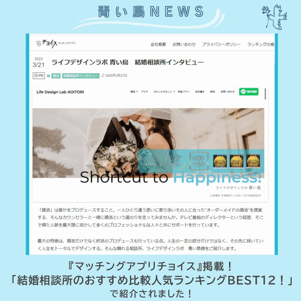 先日「青い鳥ニュース」(5/1)に書きましたが、婚活情報サイト『マッチングアプリチョイス』から取材を受けました。