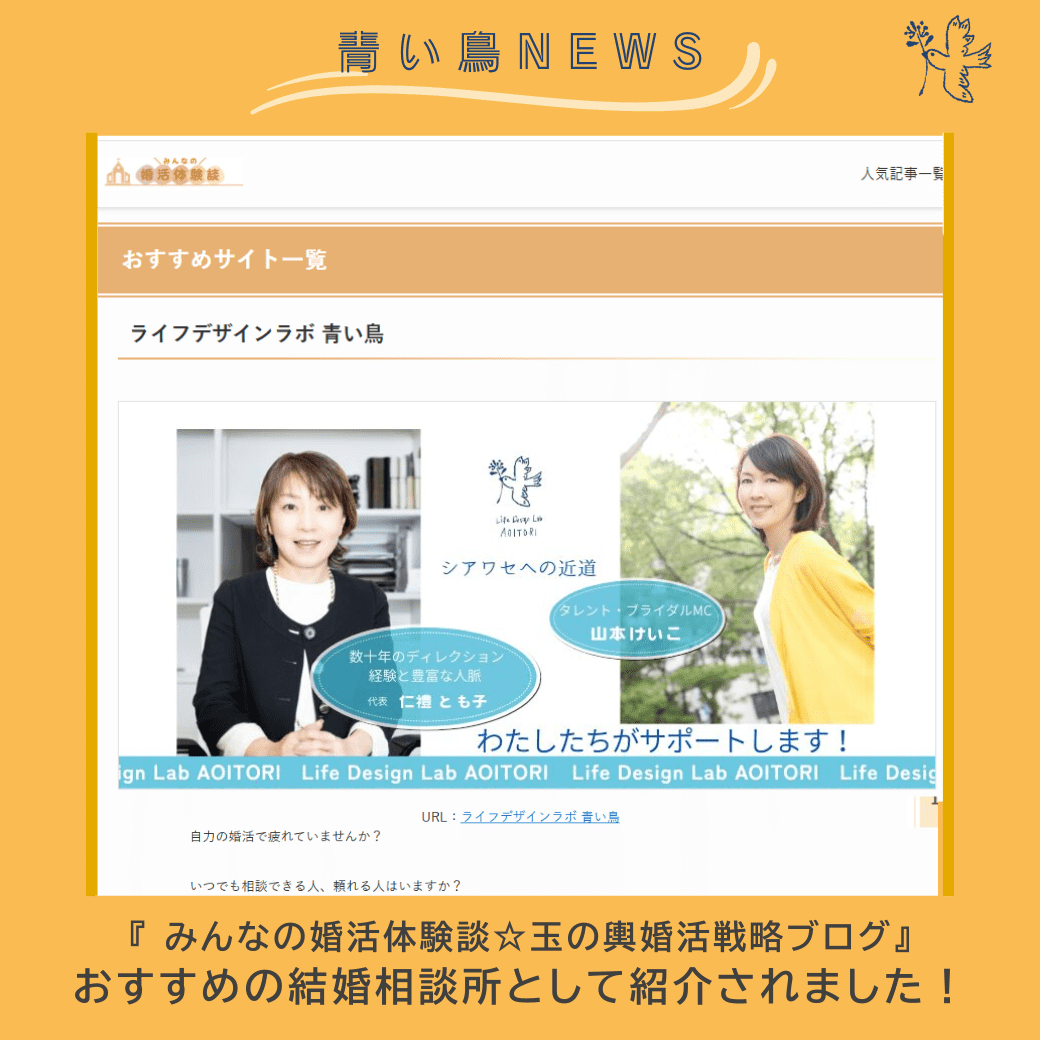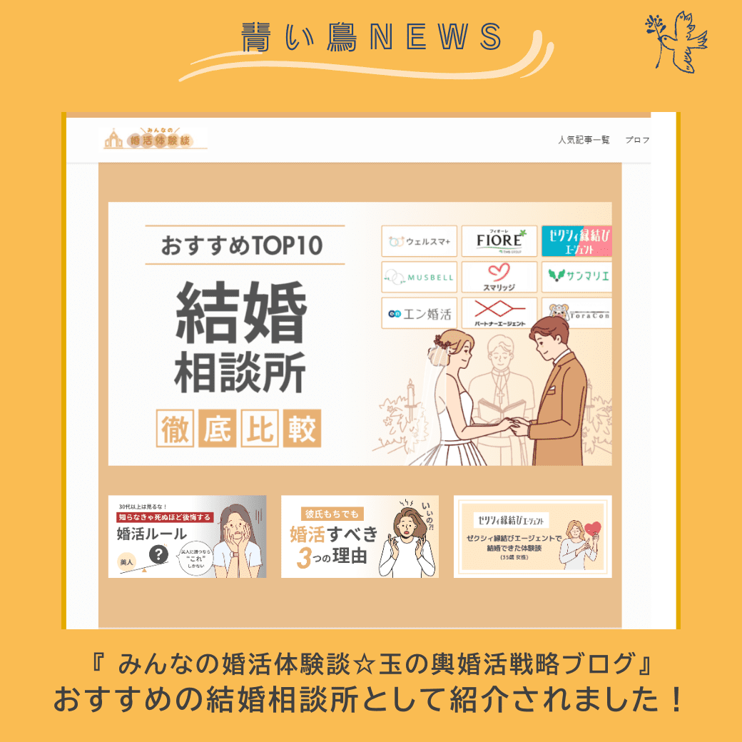 婚活情報サイト『みんなの婚活体験談☆玉の輿婚活戦略ブログ 」で、青い鳥がおすすめの結婚相談所として紹介されました!