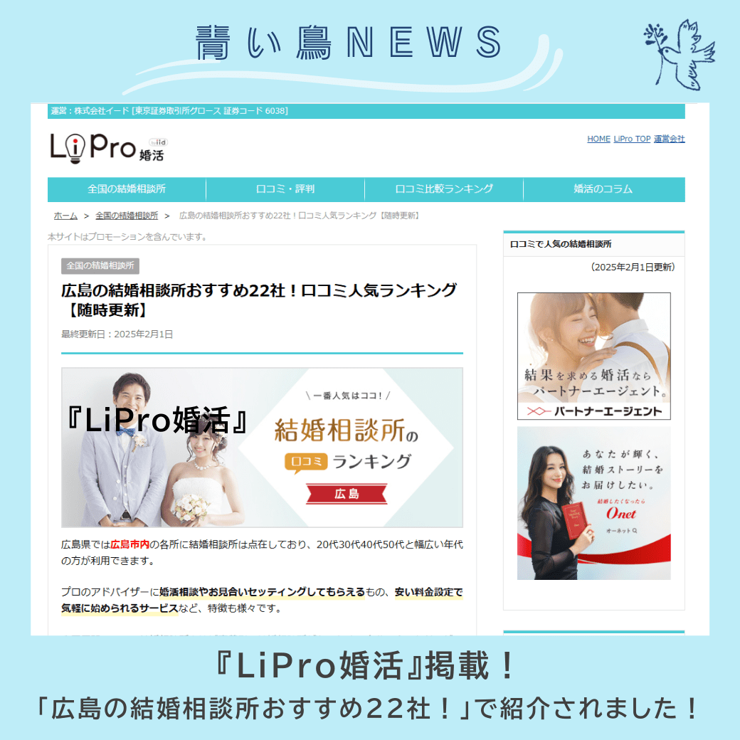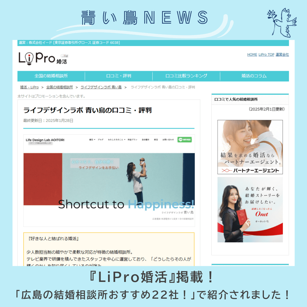婚活情報サイト『LiPro婚活』掲載!「広島の結婚相談所おすすめ22社!」に選ばれました! 2025年3月7日 婚活情報サイト『LiPro婚活』、「広島の結婚相談所おすすめ22社!口コミ人気ランキング」(地域密着型の結婚相談所部門)特集で、青い鳥が掲載されました!『LiPro婚活』は、東京証券取引所上場の株式会社イード(IID, Inc.)が運営するニュースメディア「LiPro」の中の婚活サイトです。全国の結婚相談所の情報・口コミ・ランキングなど日本最大級の規模で提供しているサイトです。この度はご紹介いただきありがとうございました。掲載記事はこちら 『LiPro婚活』ライフデザインラボ青い鳥 「ライフデザインラボ 青い鳥」では、婚活プロデュース・成婚退会後まであらゆるサポートとサービスを用意しています 広島で婚活するなら! ライフデザインラボ 青い鳥 まずは無料相談☆下記お問い合わせフォームからメッセージをお願いします 無料相談応募フォーム ライフデザインラボ 青い鳥は IBJ正規加盟店です