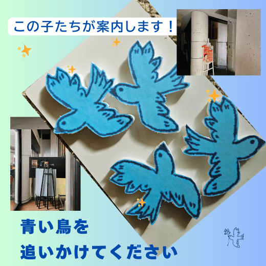 青い鳥をあちこちに飛ばしていますので(標識のように)、探しながら会場に辿り着いてください😊!