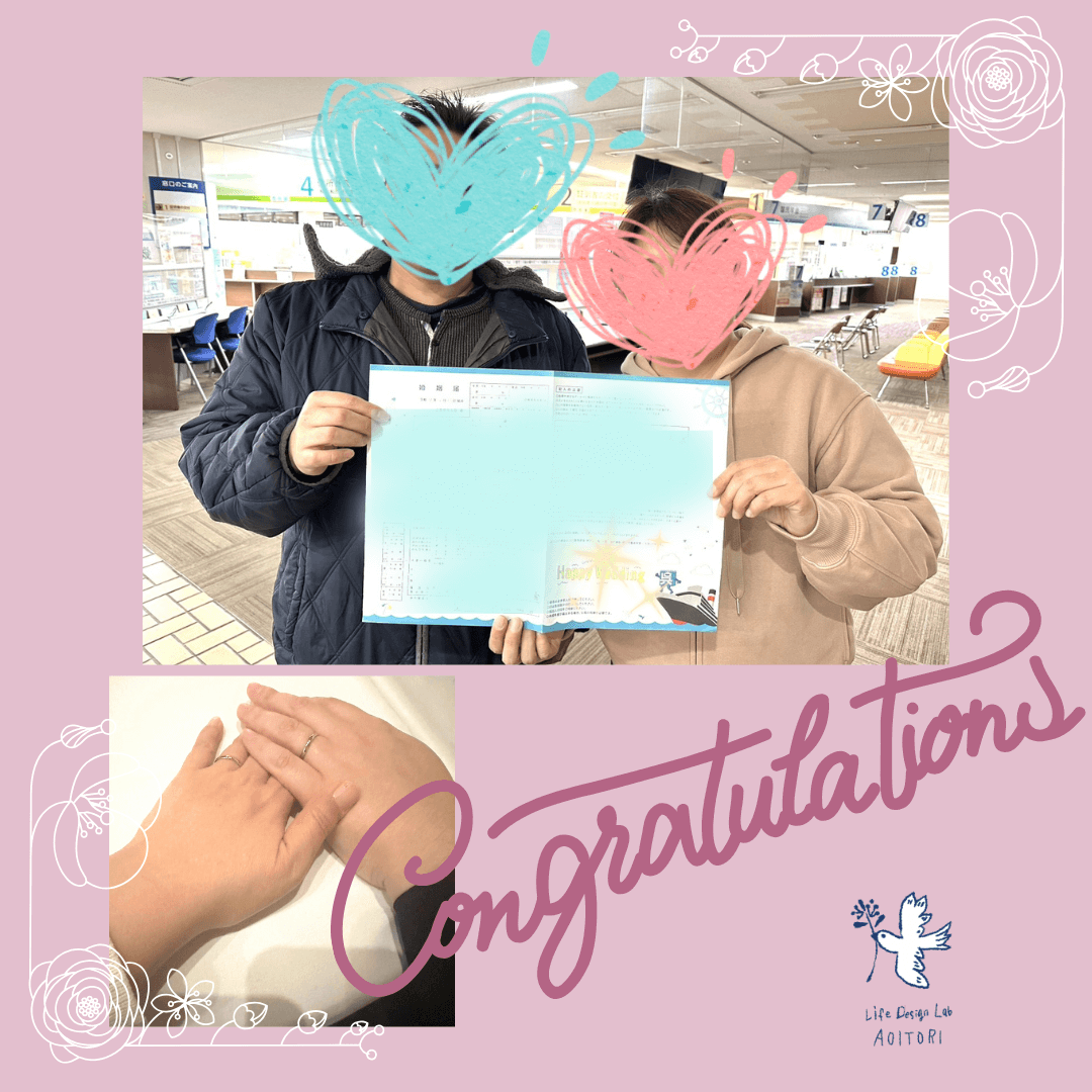 広島の結婚相談所、ライフデザインラボ青い鳥の仁禮とも子です😊昨年秋に成婚退会された女性会員のMちゃんから、「年末に入籍しました✨」という、とても嬉しいご報告をいただきました✨このおふたり、『プロポーズ』にまつわるたくさんのエピソードを持っていて…💑(実はプロポーズは一度ではありませんでした…)それはそれは切なかったり、びっくりしたり、つい笑ってしまうような数々の出来事があったのだけど、この入籍の日をもって、すべてがあたたかく完結しました✨入籍の日は、二人が出会った日からちょうど7カ月後の同じ日でした。当日、ふたりで決めた日程に、仕事終わりで待ち合わせ。婚姻届けを持ち、ドキドキわくわくしながら向かったのは、「広島市役所」(の時間外窓口・・・)。はい。違います😂婚姻届けの提出先は、広島市内の場合、「区役所」なのです。。幸い、隣に中区役所があって無事に届けを提出できたそうで、事なきを得ました。。。(このふたりはこれからも微笑ましいエピソードを作り続けることでしょう😊) 成婚(プロポーズ)まで、本当にいろいろあったおふたり。でも、いろいろなことがないカップルなんてきっといないかな。青い鳥としても、感動ひとしおです。。。とてもシャイで不器用な彼と、いつもニコニコしているMちゃん、婚姻届けを持つおふたりの笑顔で、時間外の静かな区役所に幸せな空気があふれているようです☺️その数日後の年末のある日、「クリスマスは仕事でいっしょに過ごせなかったから」と、彼が素敵なレストランを予約して、入籍のサプライズディナーを用意してくれたそうです💐💕「この人といる時は頑張らなくていい」と、デートのたびにそう感じられたことが、結婚の決め手だったMちゃん。今年は素晴らしいスタートの年、初夏には披露宴のご予定もあります✨ご入籍、おめでとうございます✨✨!✨心から祝福いたします💐 「ライフデザインラボ 青い鳥」では、婚活プロデュース・成婚退会後まであらゆるサポートとサービスを用意しています 広島で婚活するなら! ライフデザインラボ 青い鳥 まずは無料相談☆下記お問い合わせフォームからメッセージをお願いします 無料相談応募フォーム ライフデザインラボ 青い鳥は 日本結婚相談所連盟(IBJ)正規加盟店です